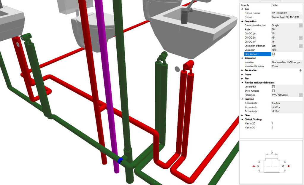 Stwórz obieg zimnej wody w systemie wody pitnej, który spełnia wysokie wymagania jakościowe. Użyj trójnika do modelowania linii systemów pierścieniowych – jest to wygodne i oszczędzające czas usprawnienie.