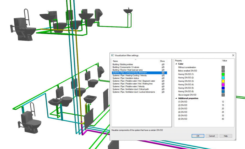 Filtr wizualizacji: Wygodna analiza wymiarów sieci rurociągów
